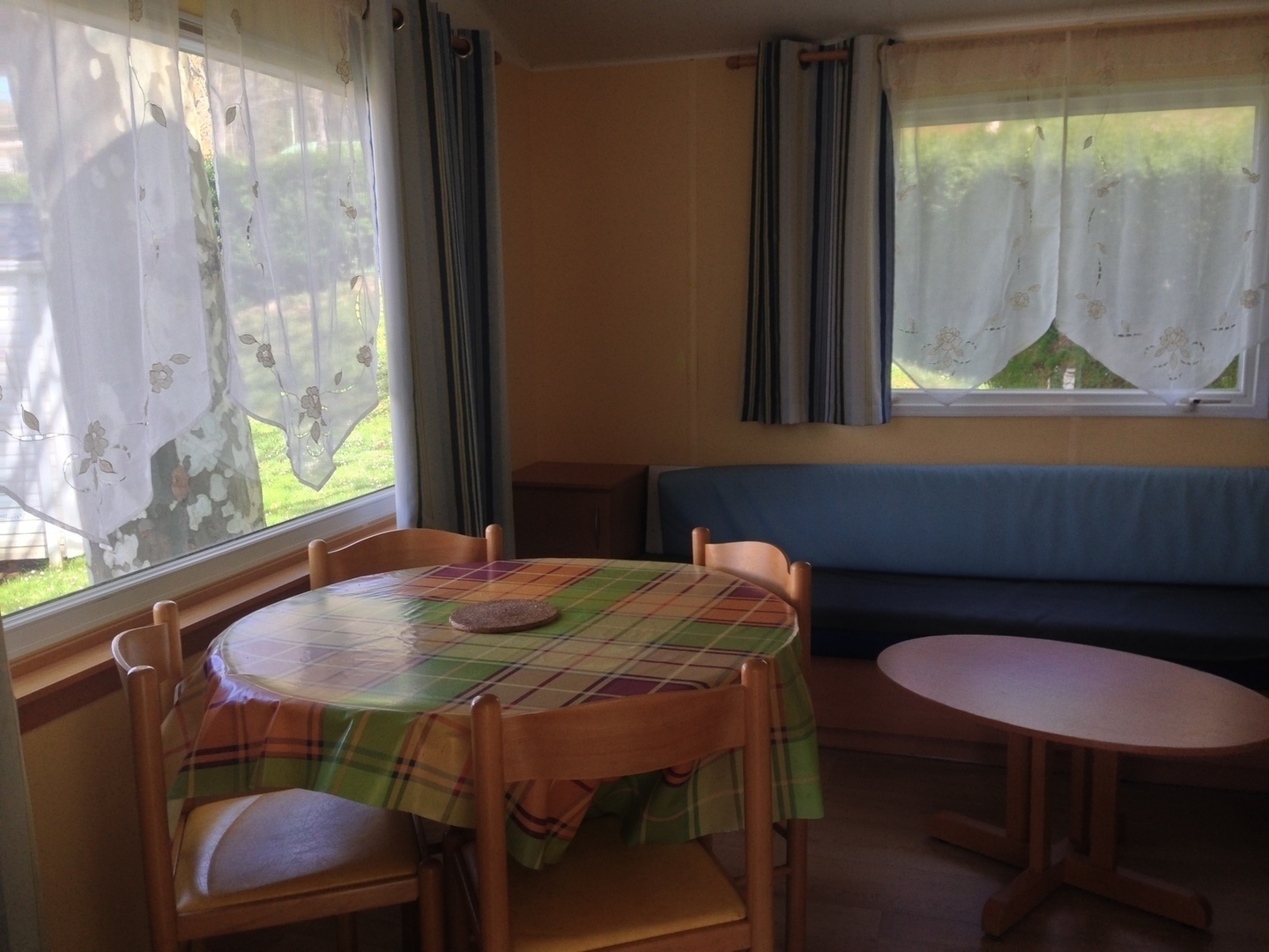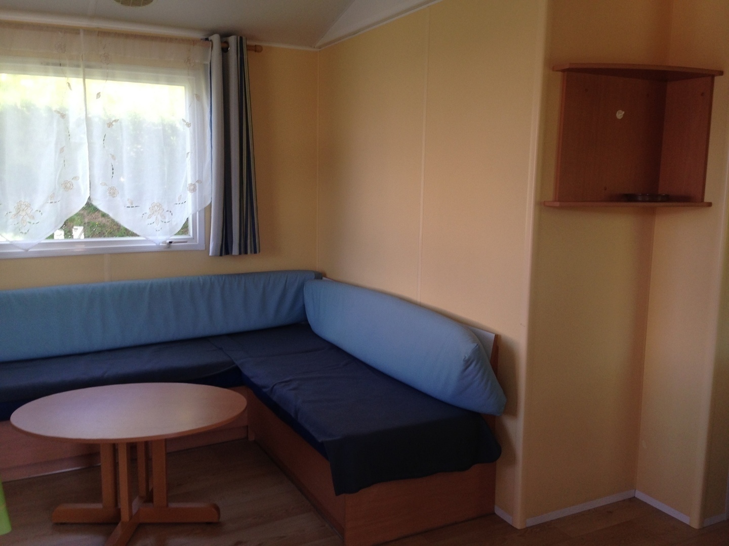 Un mobil-home trois chambres avec un lit parental dans l’une et deux lits une personne dans les deux autres ainsi qu’un coin salon convertible, autorisant l’accueil de 8 personnes.